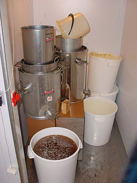 Die Honigwaben werden von den Bienenstöcken genommen und mit Leerwaben ersetzt. Zu Hause im Schleuderraum werden die Waben entdeckelt, (die Wachsschicht von den Zellen entfernt) und dann gechleudert. Der Honig wird mehrfach gesiebt und einige Tage ruhend gelassen, damit sich die kleinen Lufteinschlüsse zu einer Schaumschicht oben sammelt.