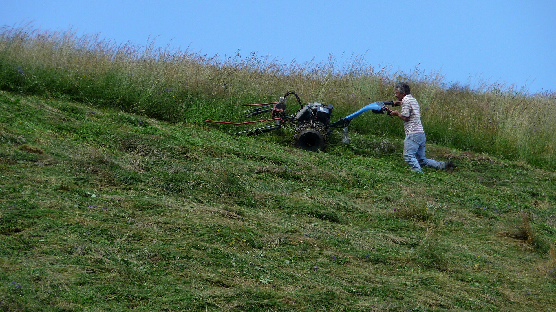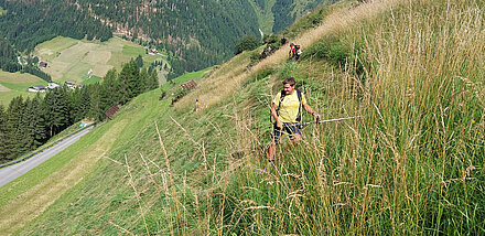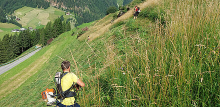 Die Gesamtfläche unseres kleinen Betriebes ist 18 ha (Wald und Grünland). Die Heimfläche am Bauernhof und die Almwiese auf der Unterstalleralm werden 2-mal gemäht. Bei uns bleiben moderne Maschinen großteils in der Garage – Handarbeit steht auf der Tagesordnung. Aufgrund der überaus steilen Hänge ist das Arbeiten mit Traktor & CO nicht möglich.